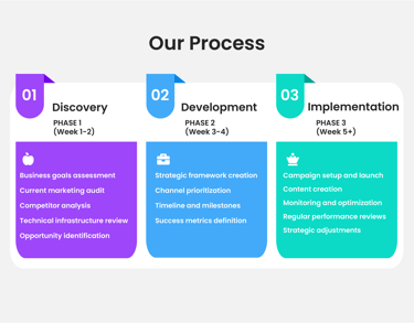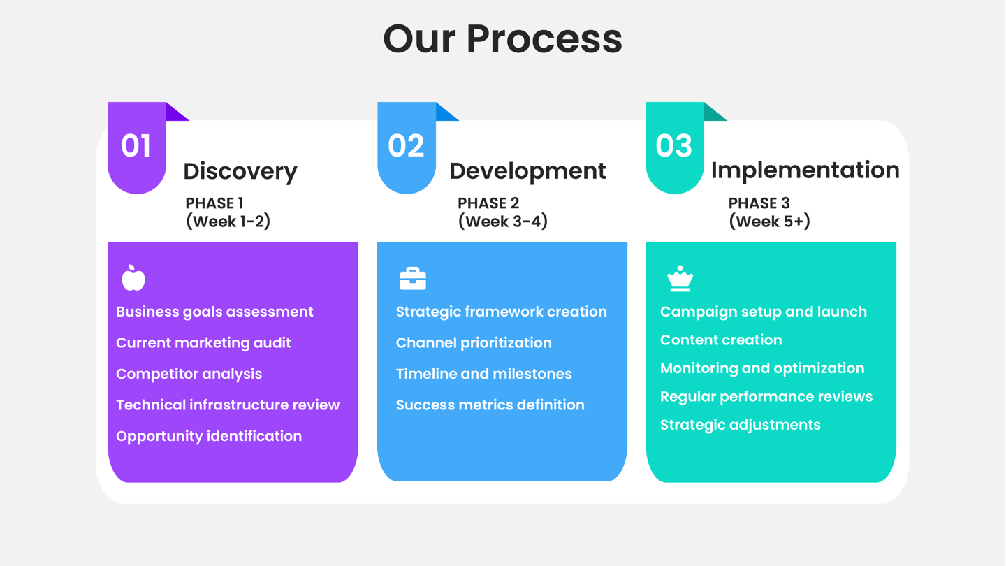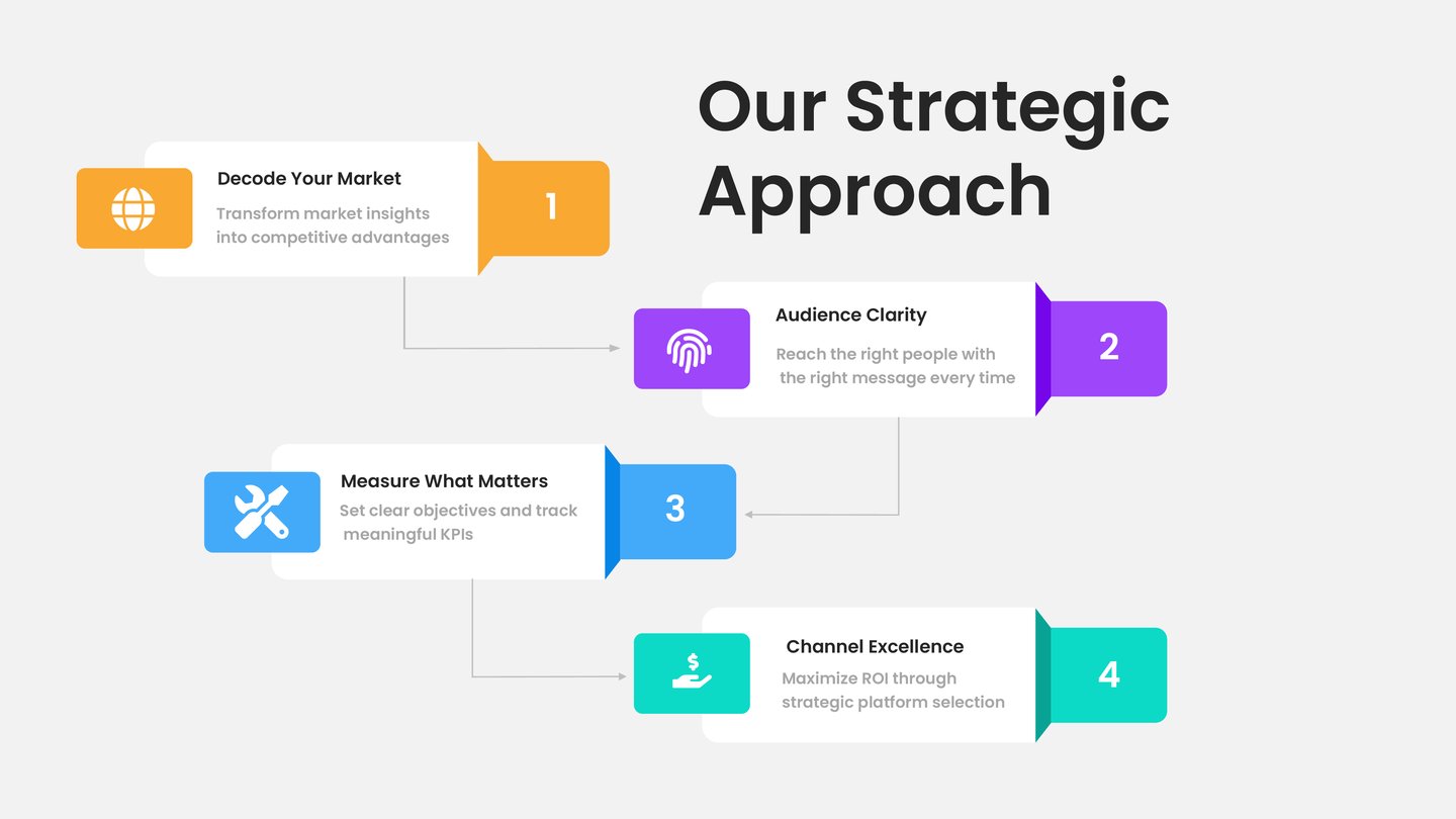 We begin by understanding your market landscape, analyzing competitor strategies, and identifying opportunities for growth. This foundation ensures your strategy is built on solid data rather than assumptions.